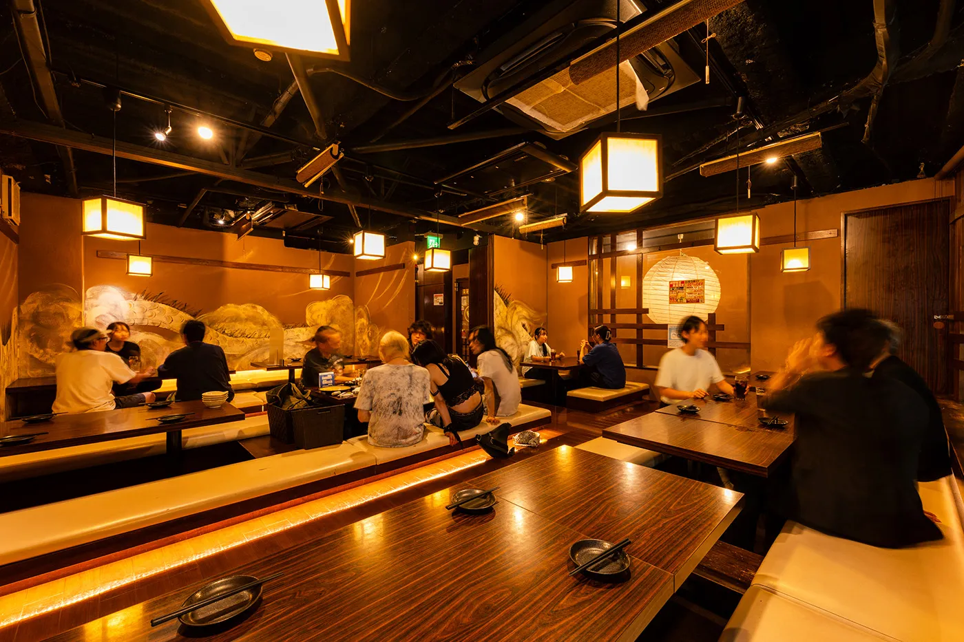 和のテイストで落ち着きのある木目と温かみを感じるライトが印象的な店内。